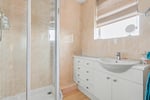 A part tiled room comprising large shower cubicle and wash hand basin set in large storage unit. Obscure double glazed window to side aspect.
