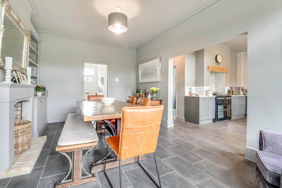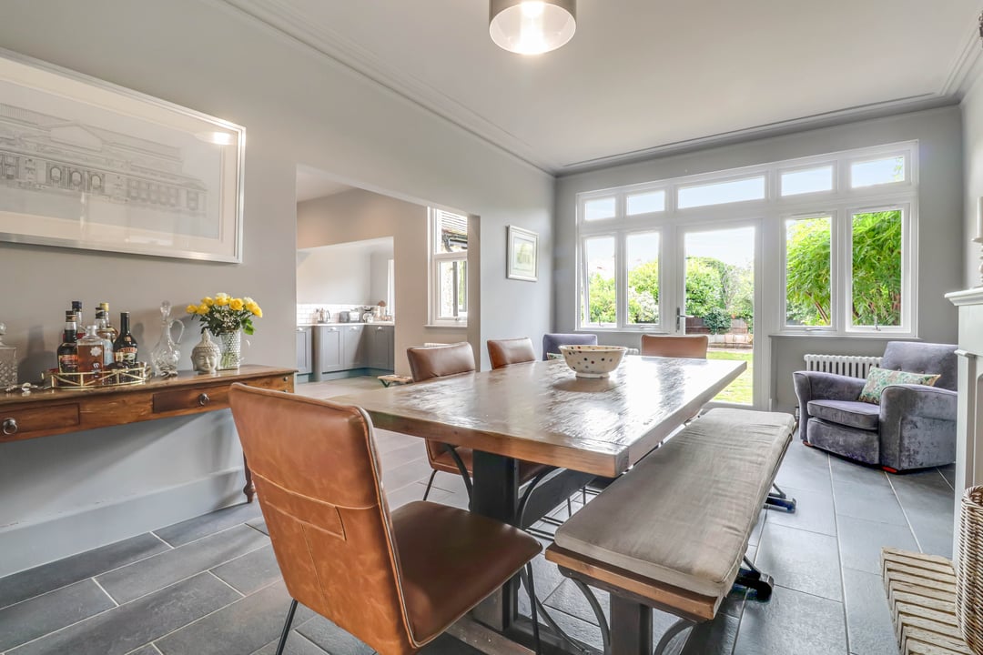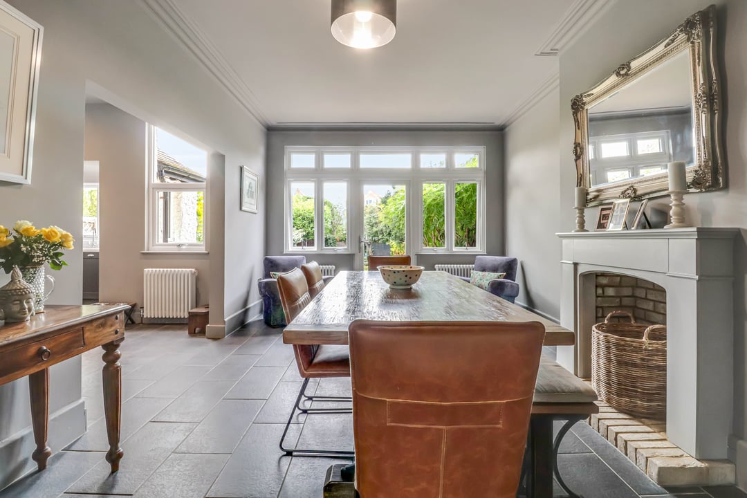 Double glazed window and door to the rear open directly onto the rear garden; perfect for entertaining. Feature fire opening. Space for a family dining table / reception area. Bespoke built-in alcove storage unit. This room is open plan to :