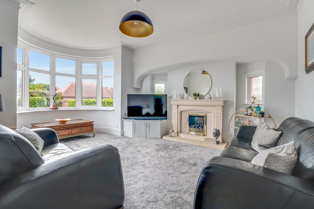 Dual aspect room with a double glazed bay window to the front and two feature windows to the side. Feature fireplace with stone surround and hearth.