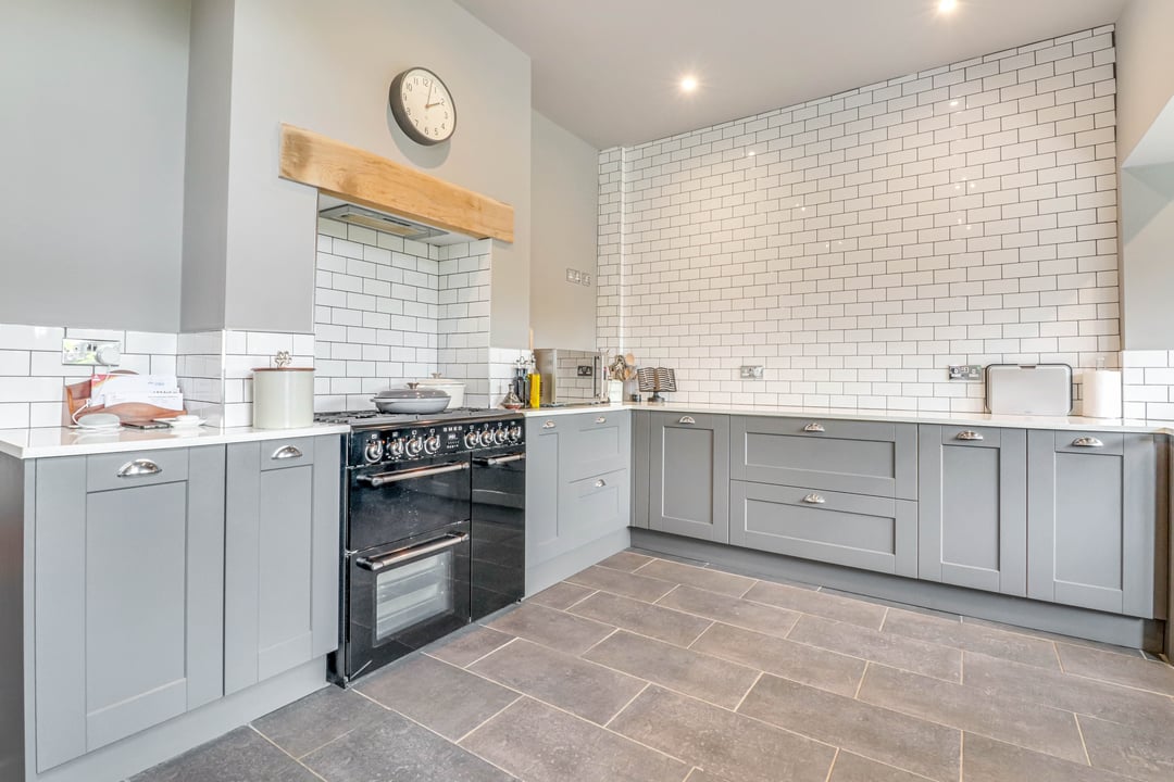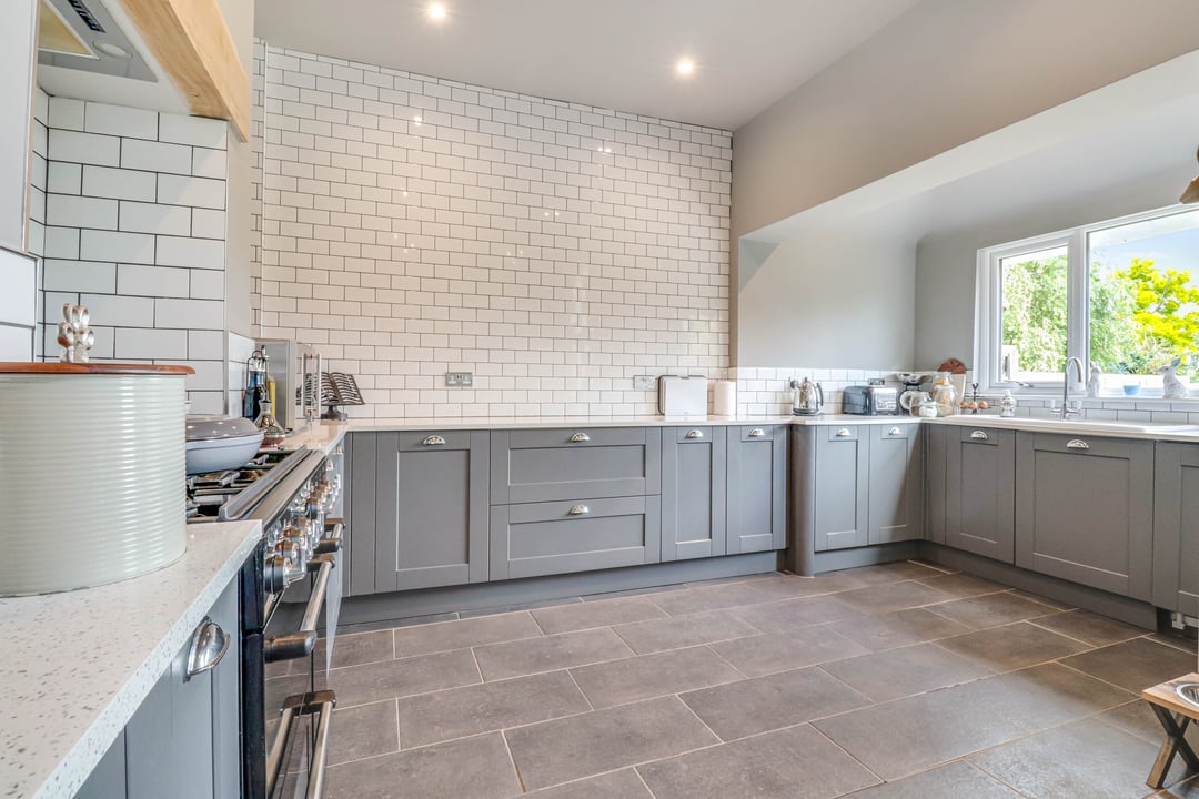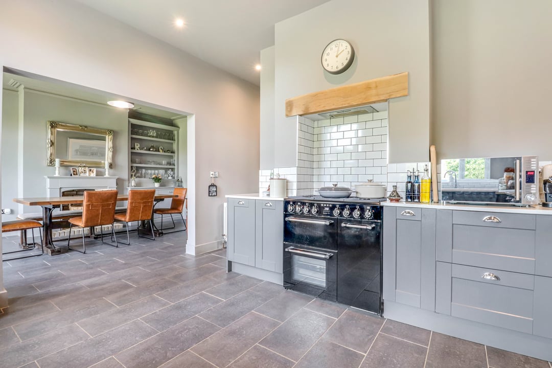 The kitchen comprises a modern range of base and eye level units complimented by the square edge work surfaces with inset ceramic sink and mixer tap. Tiled splashback. Recessed Range Oven under integrated extractor to remain. Integrated dishwasher. Double glazed window to rear aspect with views over the garden. The kitchen is open plan / leads directly to :