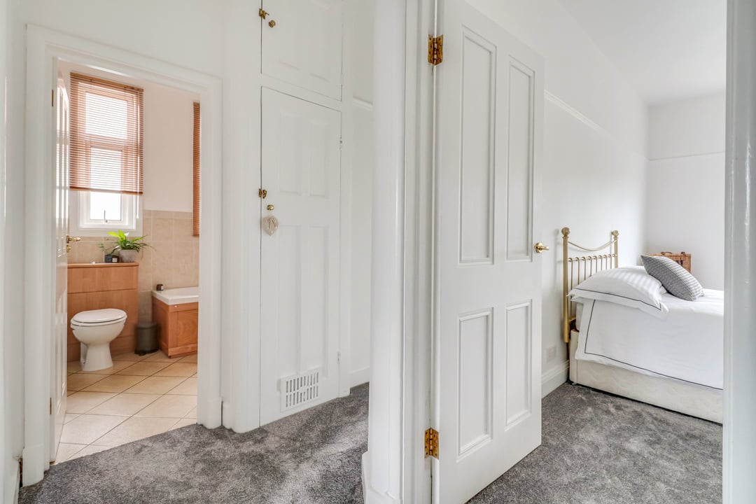 Stairs rise again to the second floor accommodation. Full height storage cupboard. Doors lead to :