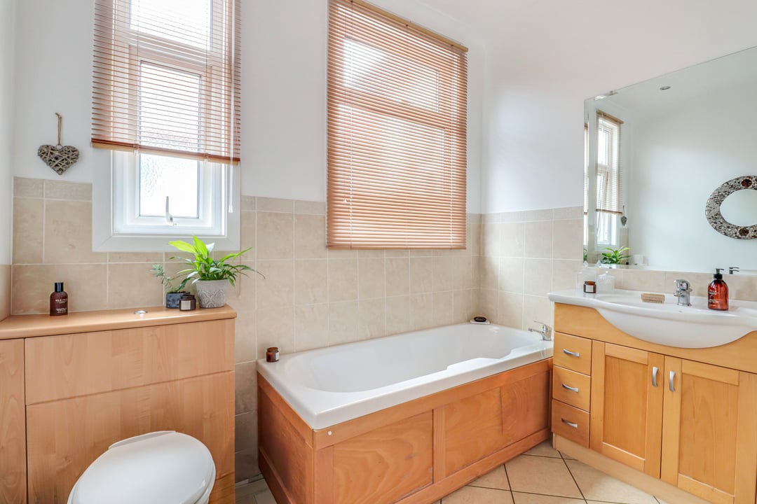 A part tiled room comprising bath, vanity wash hand basin and low level W.C with concealed cistern. Two obscure double glazed windows to side aspect.