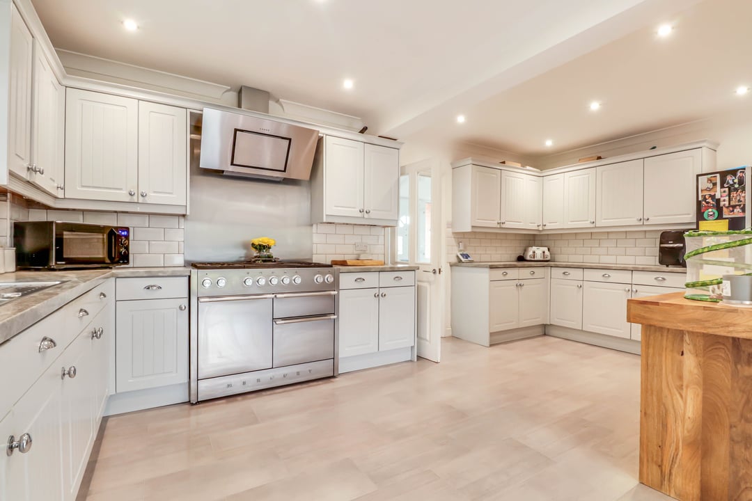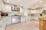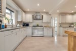 The kitchen comprises a bespoke range of full height, eye and base level storage units complemented by the square edge work surfaces with inset sink and mixer tap. Tiled splashbacks. Space for American style fridge/freezer. Space for Range oven under extractor. Double glazed window to side aspect. This room is open plan to :