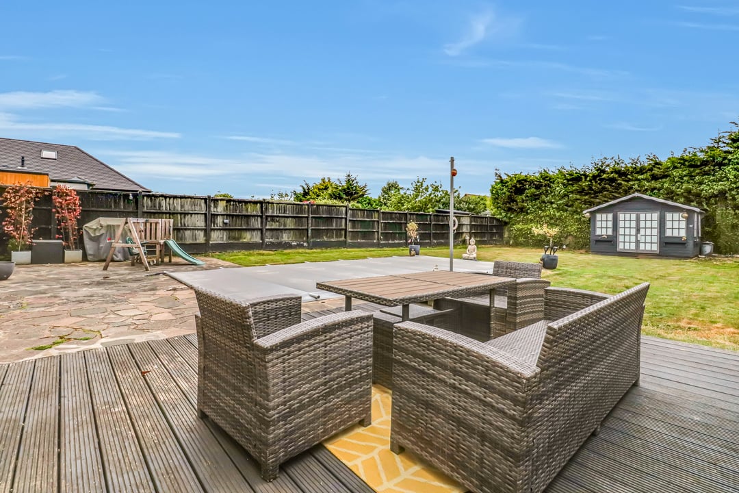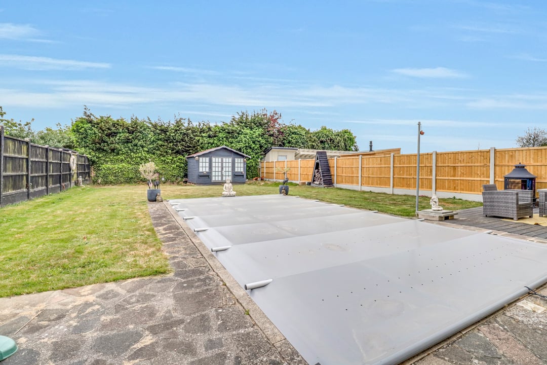 The west backing garden extends to circa 75' and commences from the back of the property with a paved area and also a separate decked entertaining space. Swimming pool. The remainder is laid mostly to lawn. Timber Summerhouse to remain - currently being used as a changing room. Gated side access to :
