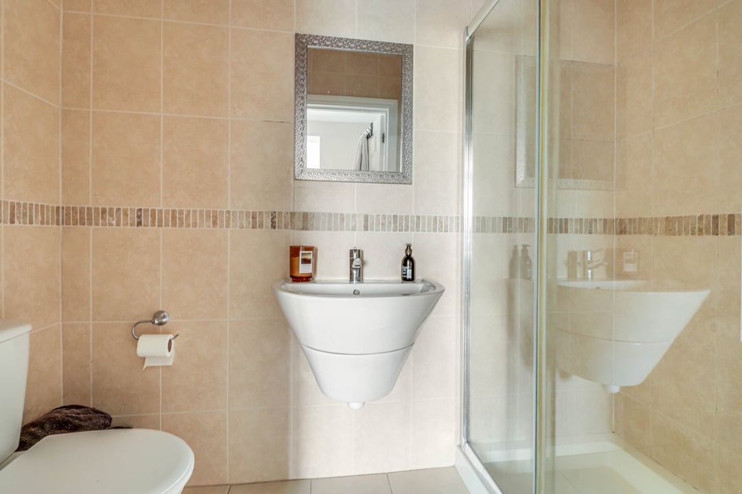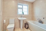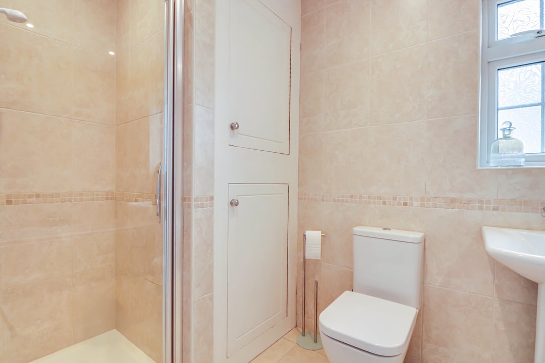 Comprises panelled bath with mixer taps, wash hand basin with mixer taps, low level W.C. and shower cubicle. Tiled floor and walls. Built in storage cupboard. Obscure double glazed window to rear aspect.