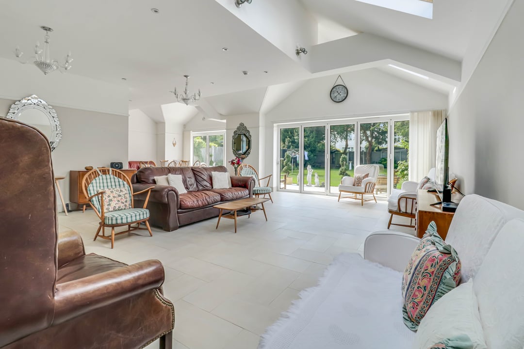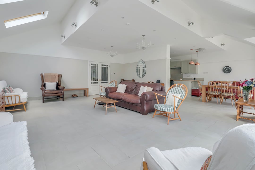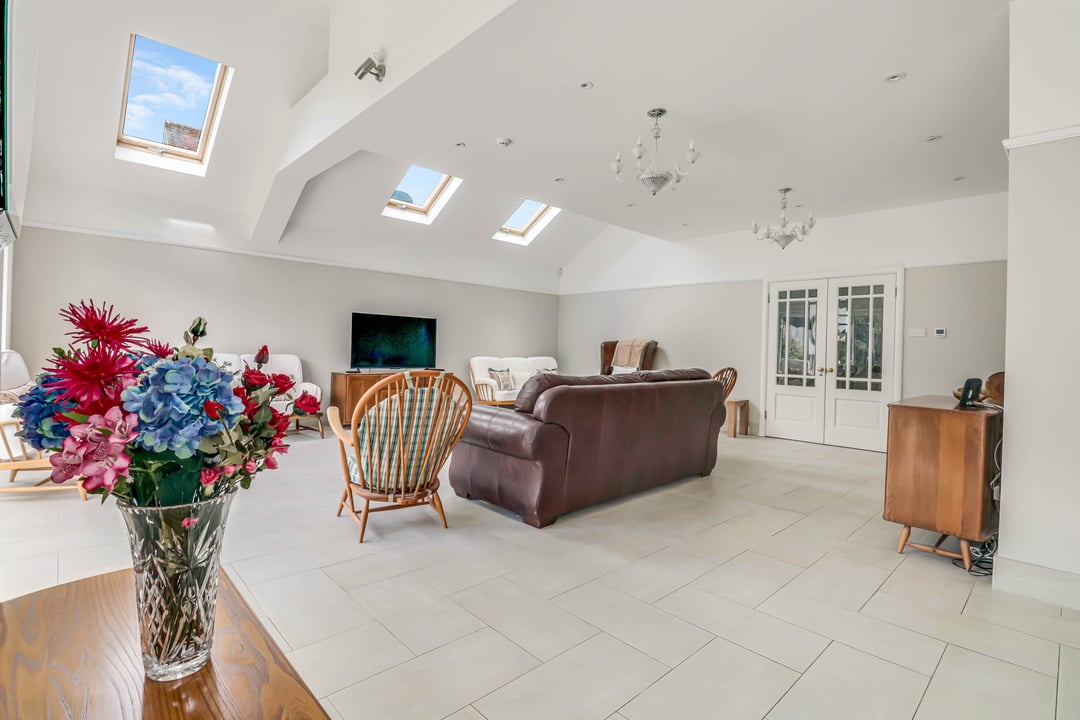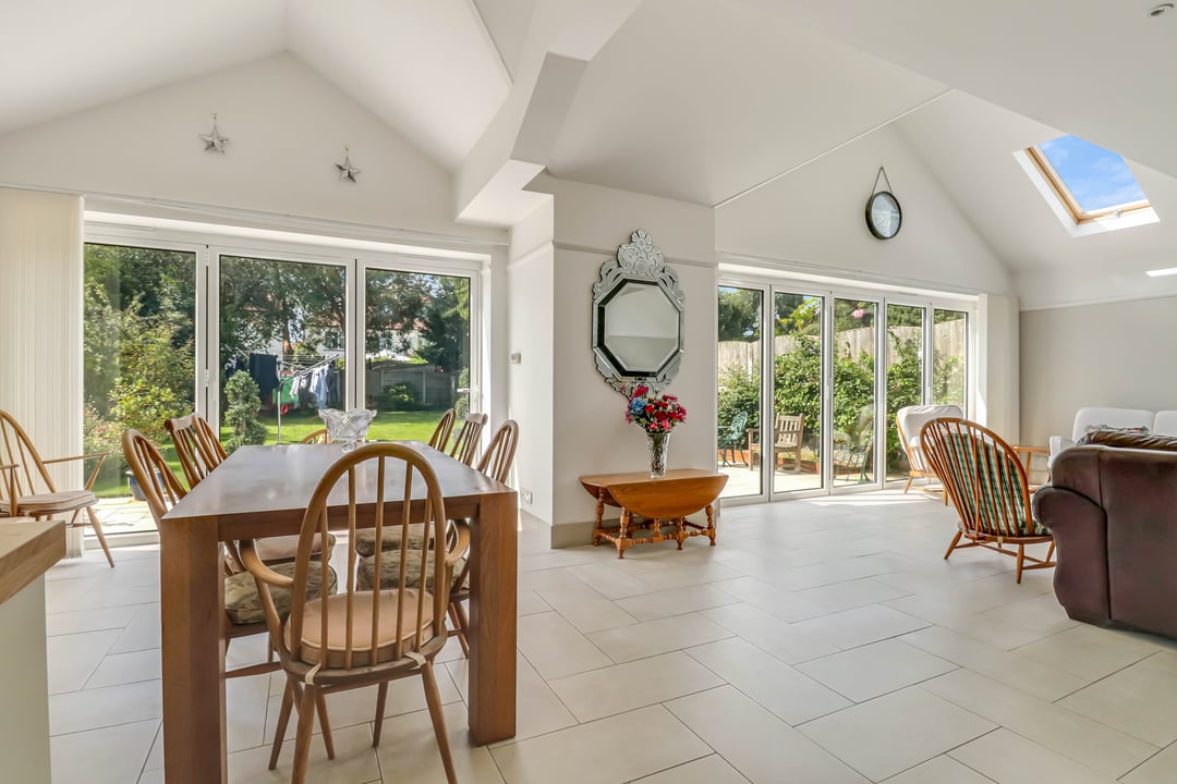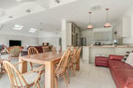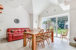 The heart of the house, this open plan space benefits from vaulted ceilings with three double glazed skylight windows. Space for a dining table or seated reception area ahead of double glazed bi fold doors that open directly onto the south backing garden; perfect for entertaining. Tiled floor with under floor heating. This space links freely with :