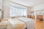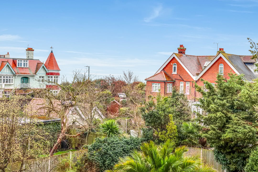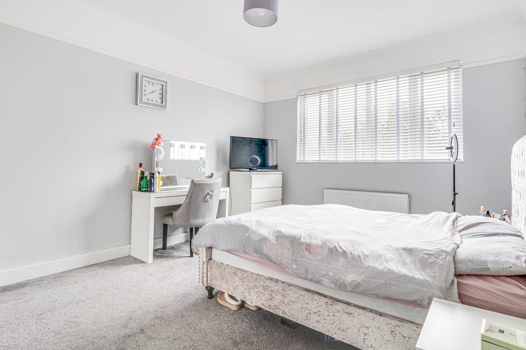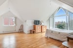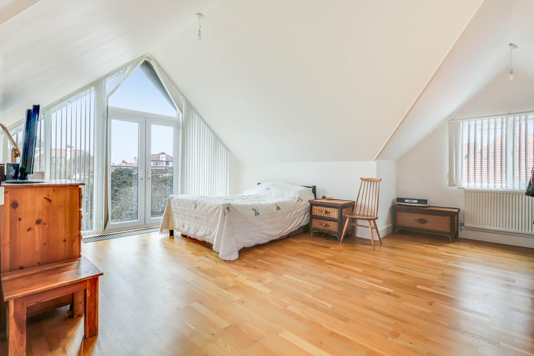 A triple aspect room with vaulted ceilings - two double glazed windows to side aspects and full width double glazed windows with French doors that open onto the Juliette balcony affording views across the rear garden and towards the Thames Estuary. Access to eaves storage. Wood flooring. Courtesy door links with :