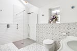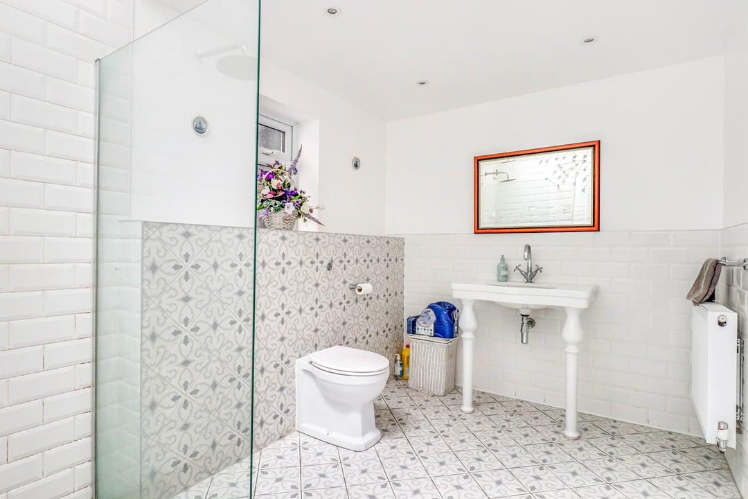 A fully tiled room comprising large walk in shower enclosure, low level W.C. with concealed cistern and vanity wash hand basin with storage beneath. Double glazed window to side aspect.