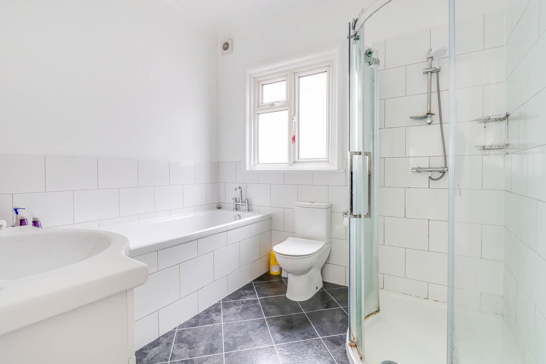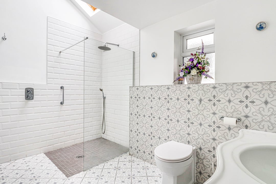 A part tiled room comprising panelled bath, fully tiled shower cubicle, low level W.C. and vanity wash hand basin with storage beneath. Heated towel rail. Shaver point. Double glazed window to side aspect.