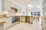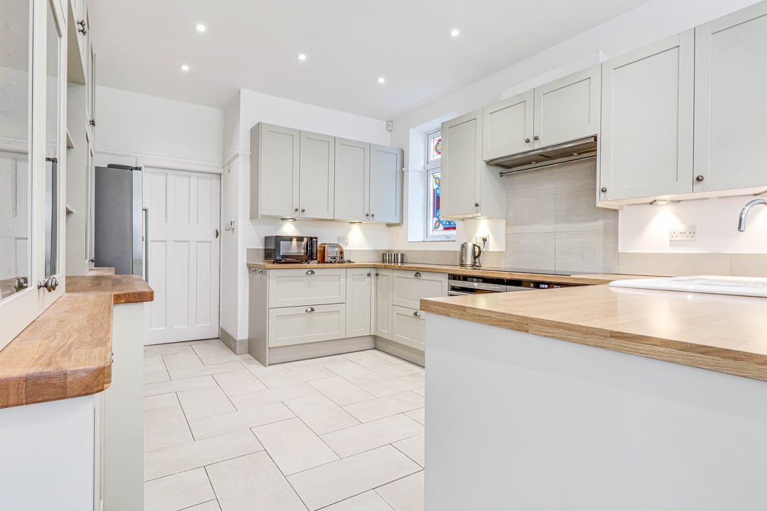 The kitchen comprises a bespoke range of eye level and base storage units complemented by the wood effect work surfaces with inset sink and mixer tap. Tiled splashbacks. Inset Siemens six ring induction ceramic hob with Miele extractor fan above. Two built in Siemens ovens below with warmer drawer. Space and plumbing for dishwasher. Tiled floor with under floor heating. Space for American double fridge/freezer. Feature stained glass leaded light window to side aspect. Door to :