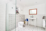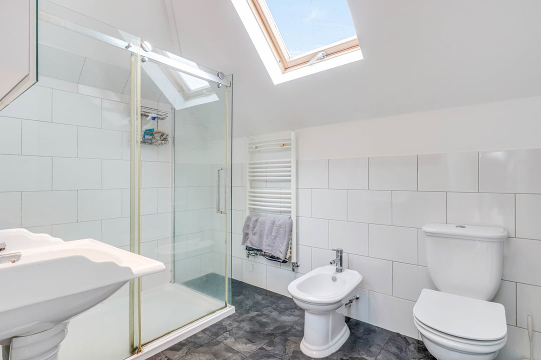 A part tiled room comprising double width shower cubicle, bidet, low level W.C. and pedestal wash hand basin. Heated towel rail. Shaver point. Double glazed skylight window.