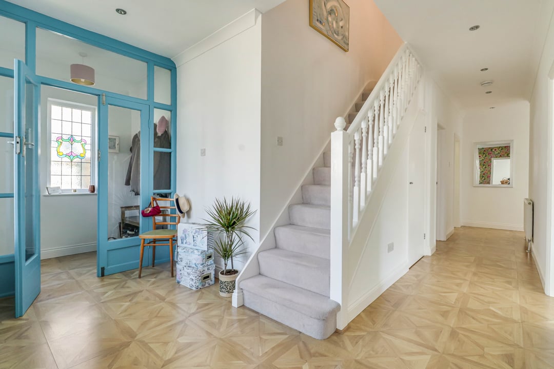 A spacious reception hall reception with stairs rising to the first floor accommodation. Under stairs storage. Feature double glazed bay window to front with built in storage and a stained glass double glazed window to the side. Oak effect wood flooring.