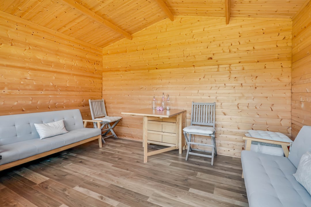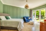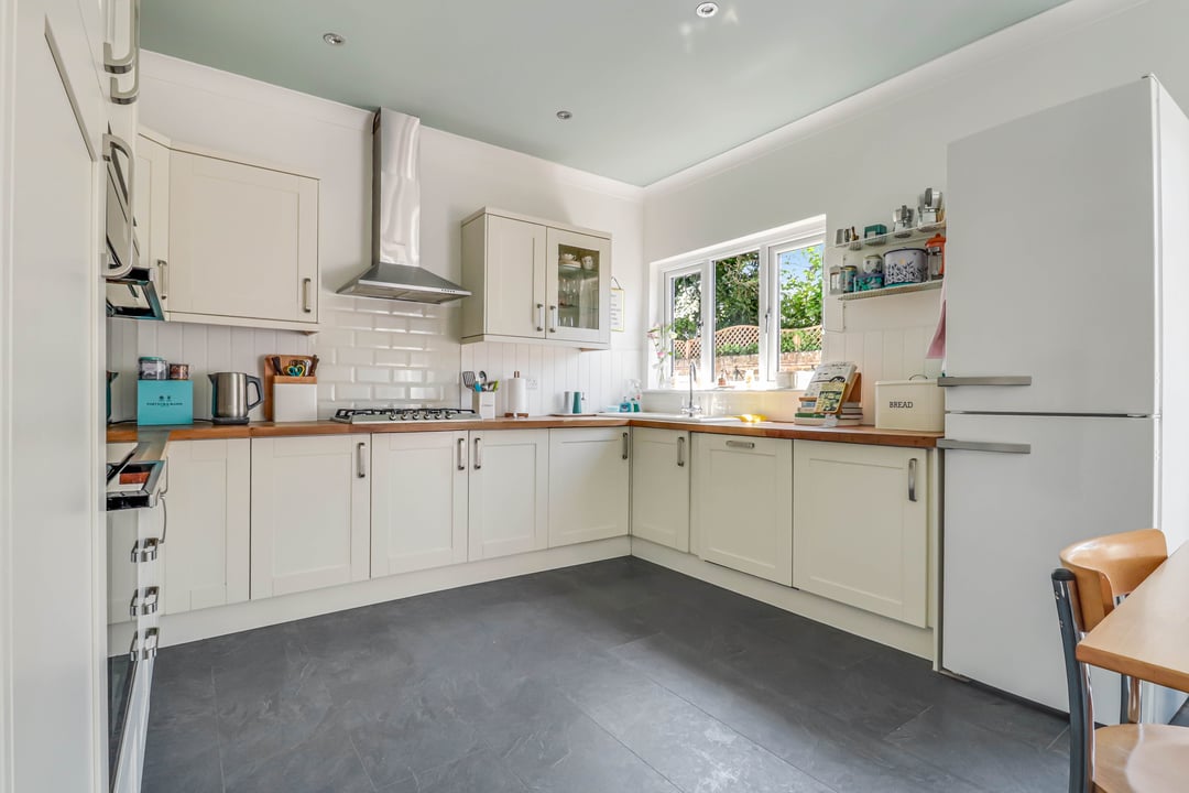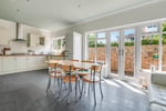 The bespoke kitchen comprises and extensive range of full height, eye and base level storage units complemented by the natural wood work surfaces with inset sink and mixer tap. Built in Smeg dishwasher. Inset Smeg five ring stainless steel gas hob with stainless steel extractor hood above. Oven housing with built in double oven. Concealed space and plumbing for washing machine and tumble dryer. Space for fridge-freezer. Away from the kitchen there is space for dining table and seated reception area. Tiled effect flooring. Double glazed windows and French double doors overlooking the South facing side courtyard.
