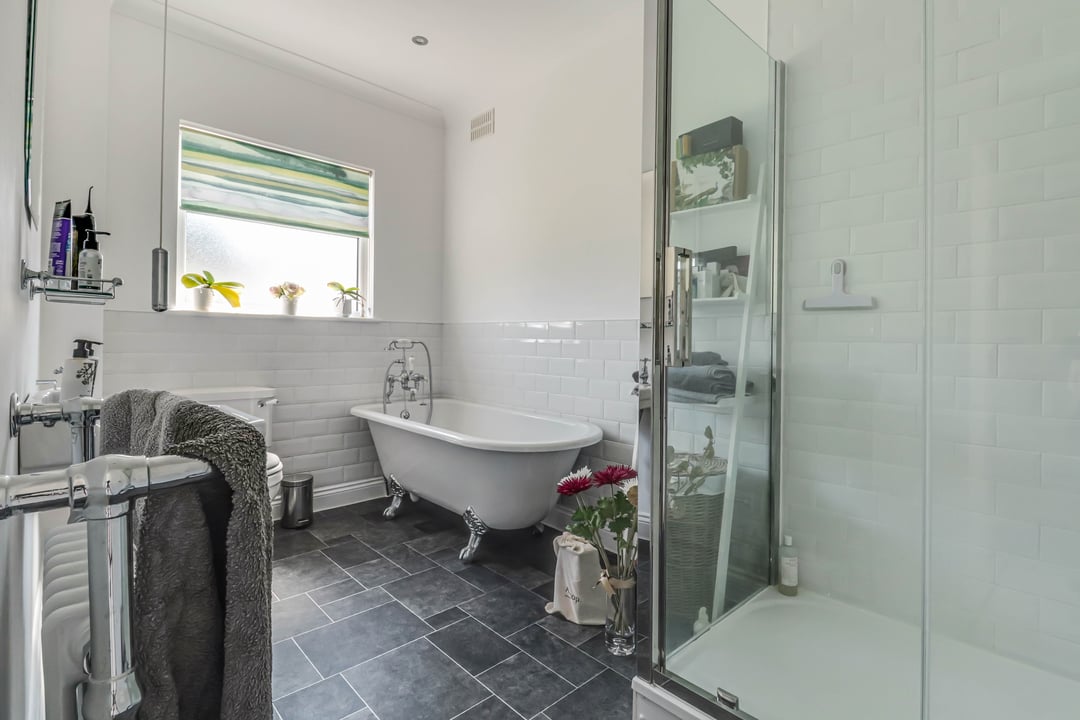 A part tiled room comprising freestanding roll top bath with claw feet, large shower cubicle, pedestal wash hand basin and low level W.C. Chrome heated towel rail with radiator. Double glazed window to rear aspect