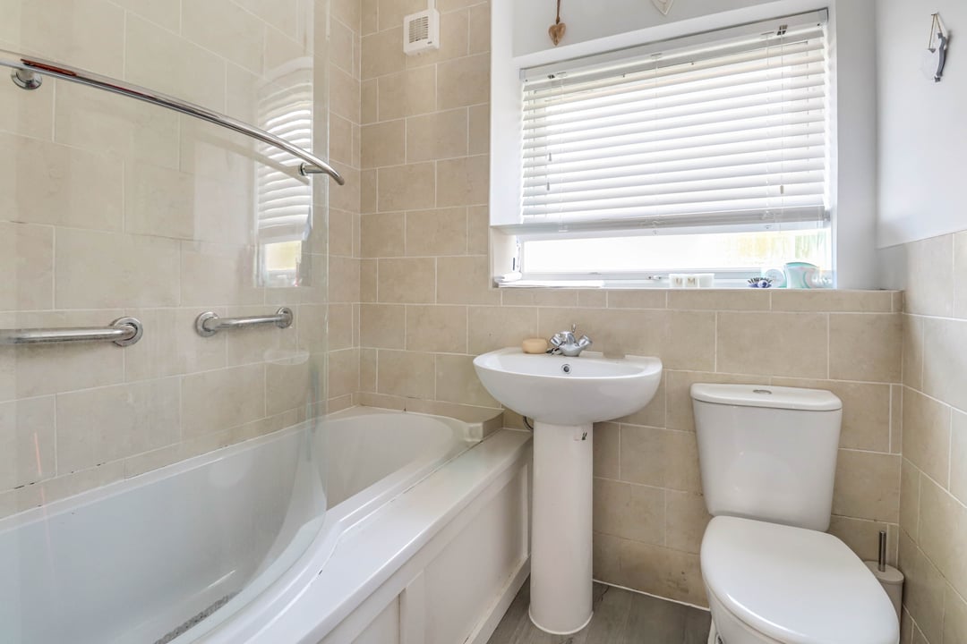A part tiled room comprising of bath with shower above and screen, low level W.C and pedestal wash hand basin. Chrome towel radiator. Obscure double glazed window to rear aspect. Extractor fan.