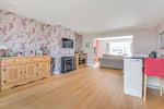 Space for a family dining table and additional seated reception area. Feature electric fireplace. Solid wood floor. Built-in ceiling speakers. This room is open plan to the kitchen and also the :