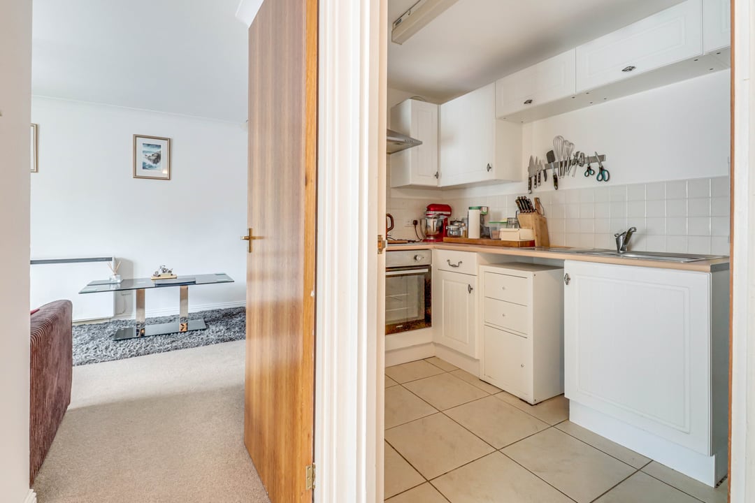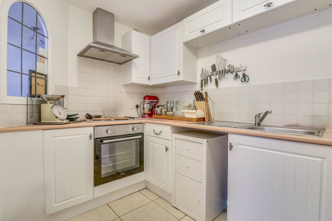 Comprises a range of base and eye level units that are complimented by the rolled edge work surfaces with inset sink and mixer tap. Tiled splashbacks. Inset four ring electric hob with extractor over and integrated oven below. Space for fridge-freezer. Space and plumbing for washing machine. Tiled flooring. Arch window to lounge.