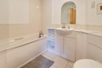 A part tiled room comprising bath, low level W.C with concealed cistern and a vanity wash hand basin set in storage unit. Extractor fan.