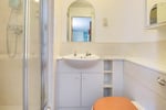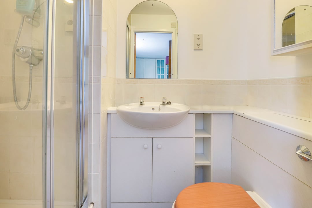 A part tiled room comprising shower enclosure, low level W.C with concealed cistern and a vanity wash hand basin set in storage unit. Extractor fan.