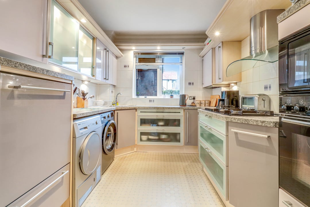 The kitchen comprises an extensive range of full height, eye and base level storage units complemented by the rolled edge work surfaces with inset sink and mixer tap. Tiled walls. Inset Miele five ring gas hob with Miele designer glass/stainless extractor hood. Oven housing with built in Miele oven and Miele microwave. Recess for fridge/freezer. Further work surface/breakfast bar with space and plumbing for washing machine and tumble dryer. Built in Miele dishwasher. Double glazed window overlooking the rear gardens.