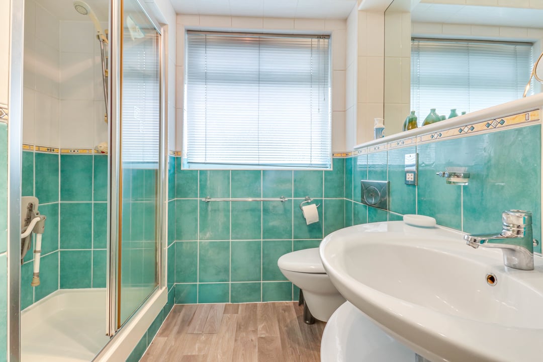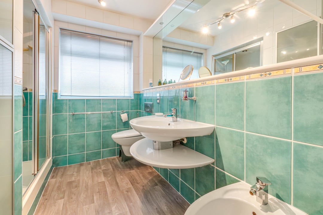 A part tiled room comprising large shower cubicle, wall mounted wash hand basin, wall mounted bidet and wall mounted W.C. with concealed cistern. Heated towel rail. Shaver point. Illuminated mirror. Built in storage cabinet. Double glazed window to side aspect.
