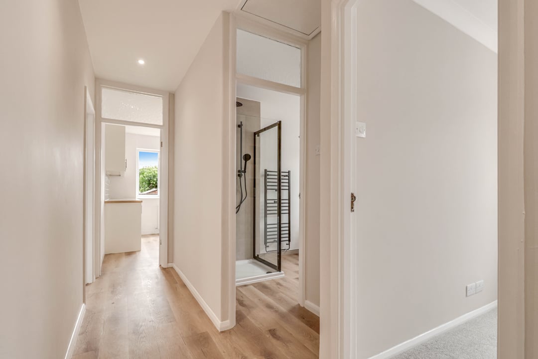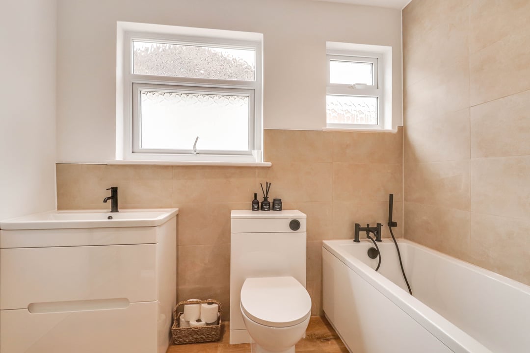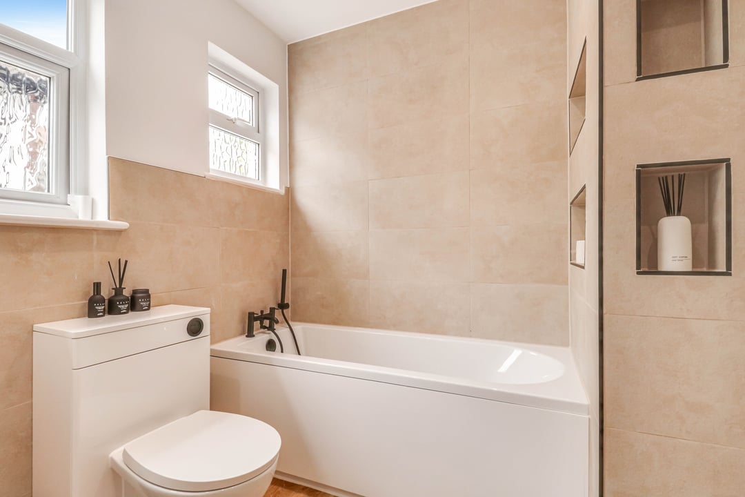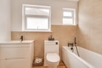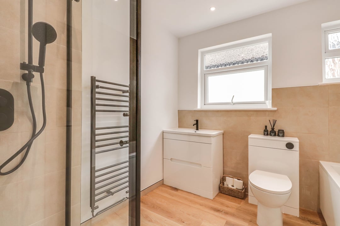 A part tiled room comprising modern shower enclosure, bath, low level W.C. with concealed cistern and a wash hand basin with storage beneath. Chrome towel radiator. Built-in storage shelves. Two obscured double glazed windows to side aspect.