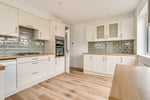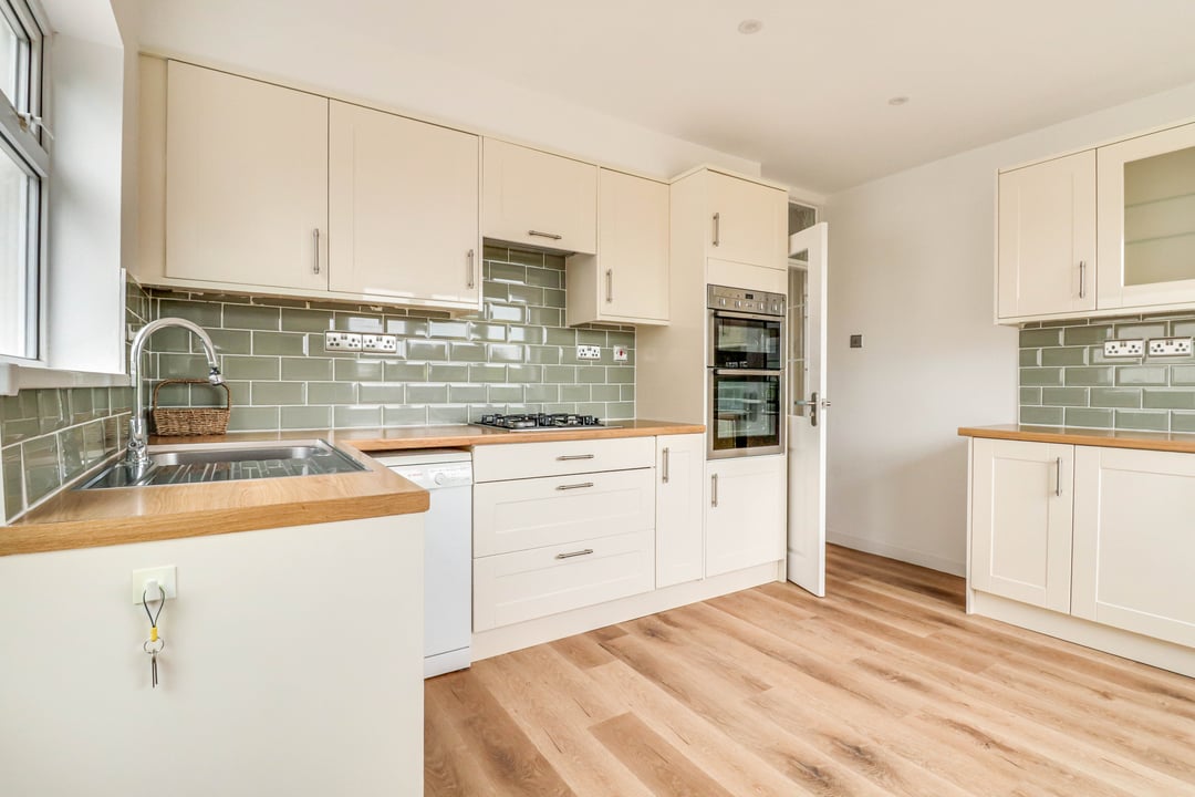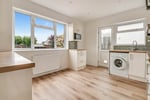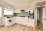 The kitchen comprises a range of full height, eye and base level storage units complemented by the rolled edge work surfaces with inset sink and mixer tap. Tiled splashbacks. Inset hob under integrated extractor. Built-in double oven. Built-in microwave. Space and plumbing for washing machine and dishwasher. Space for freestanding fridge-freezer. Space for a small breakfast table. Double glazed windows to side and rear aspects. Courtesy door to side garden area.