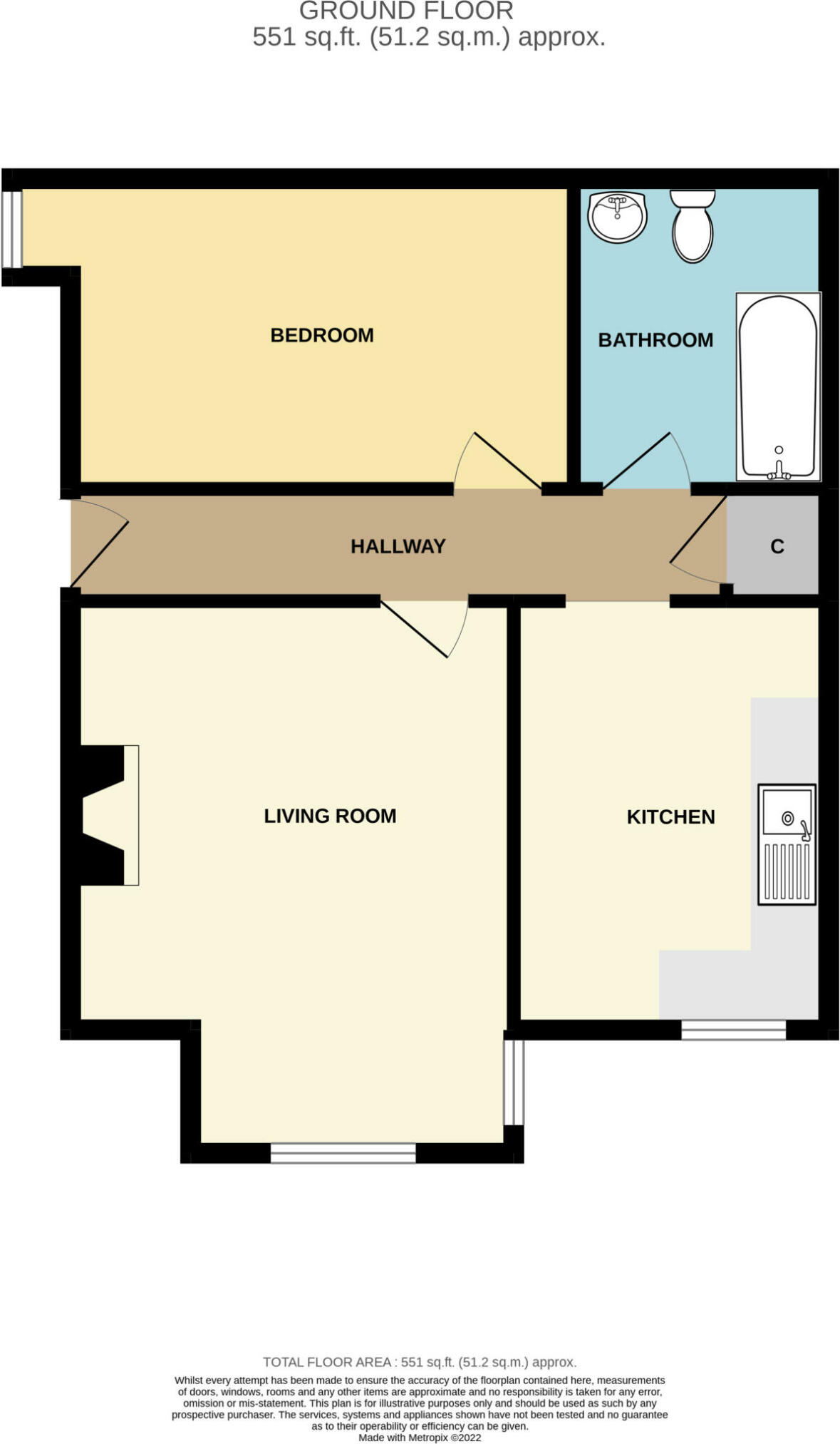 The kitchen comprises a range of eye and base level storage units complemented by the square edge work surfaces with inset sink and mixer tap. Tiled splashbacks. Inset hob under extractor. Built-in single oven. Space for fridge-freezer. Space and plumbing for dishwasher. Wall mounted boiler. Double glazed window to front aspect.