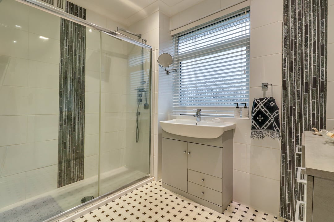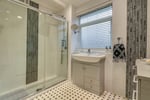 A fully tiled room comprising double width walk-in shower with glass screen and a wash hand basin with storage beneath. Heated towel rail. Obscured double glazed window to side aspect.