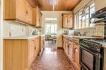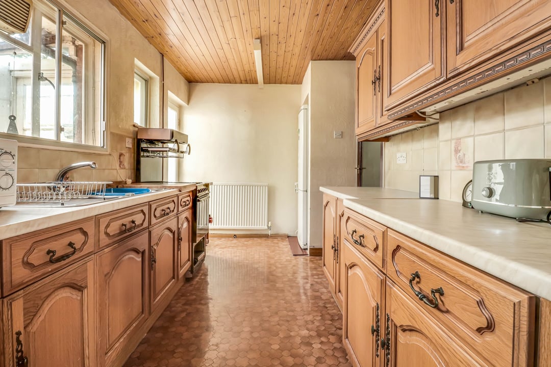 Comprises a range of eye and base level storage units complemented by the rolled edge work surfaces with inset sink and mixer tap. Tiled splashbacks. Space for freestanding oven. Recessed space for freestanding fridge-freezer. Windows to side aspect. Door to :