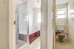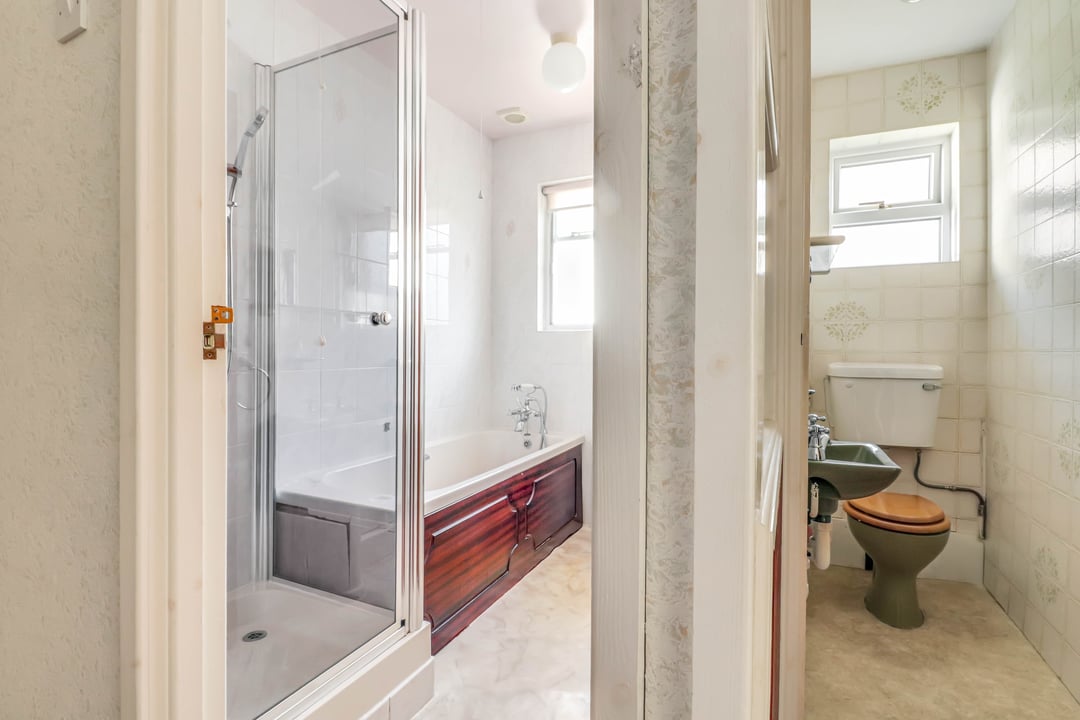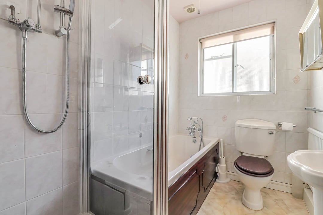 A part tiled room comprising shower enclosure, bath, low level W.C. and pedestal wash hand basin. Obscured window to side aspect. Extractor fan.