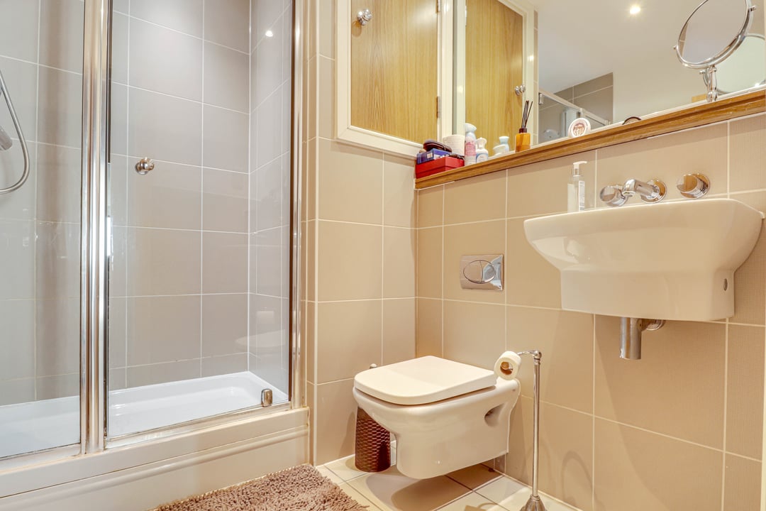 A fully tiled room comprising double width shower cubicle, wall mounted wash basin and low level W.C. With concealed cistern. Chrome heated towel rail.