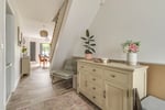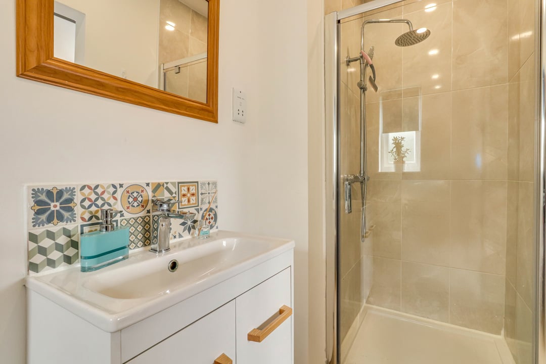 A part tiled room comprising recessed shower enclosure, low level W.C. and wash hand basin set in storage unit. Chrome towel radiator. Extractor fan.