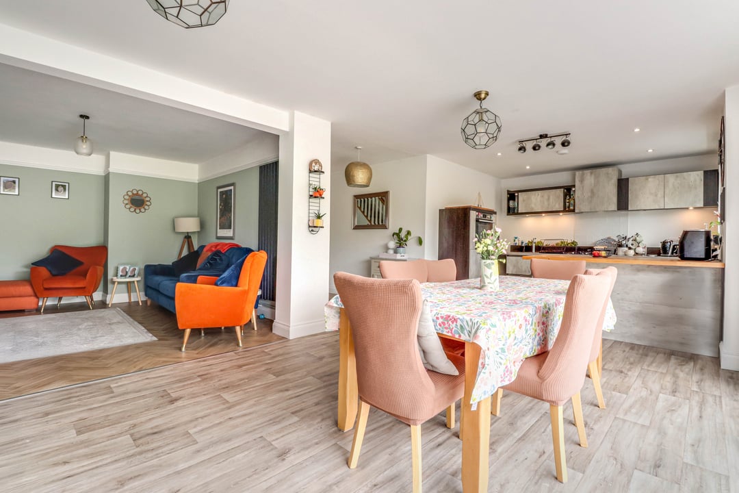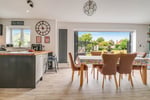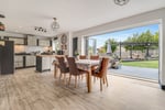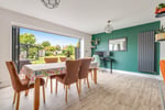 The kitchen comprises a range of three quarter height, eye and base level storage units complemented by the square edge work surfaces with inset sink and mixer tap. Tiled splashbacks. Inset hob under extractor. Built-in oven. Integrated fridge and freezer. Integrated dishwasher. Breakfast bar return with space for stools. Under unit courtesy lighting. Double glazed window to rear aspect. Away from the kitchen, there is space for a large family dining table ahead of double glazed folding doors that open directly onto the patio; perfect for entertaining. This space is open to :