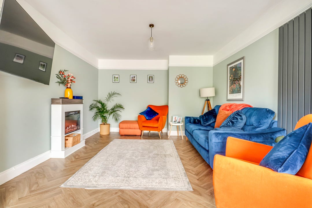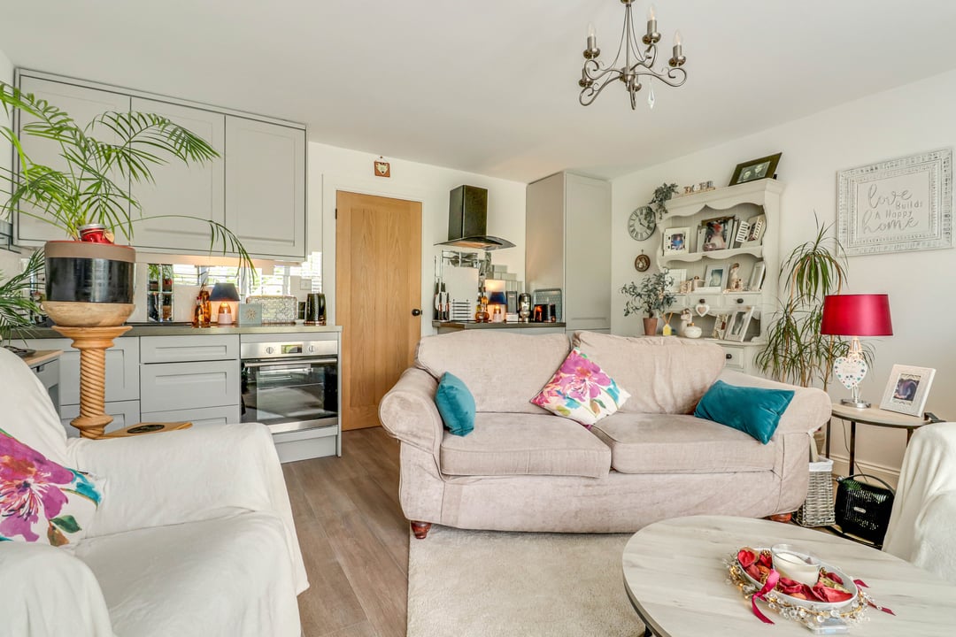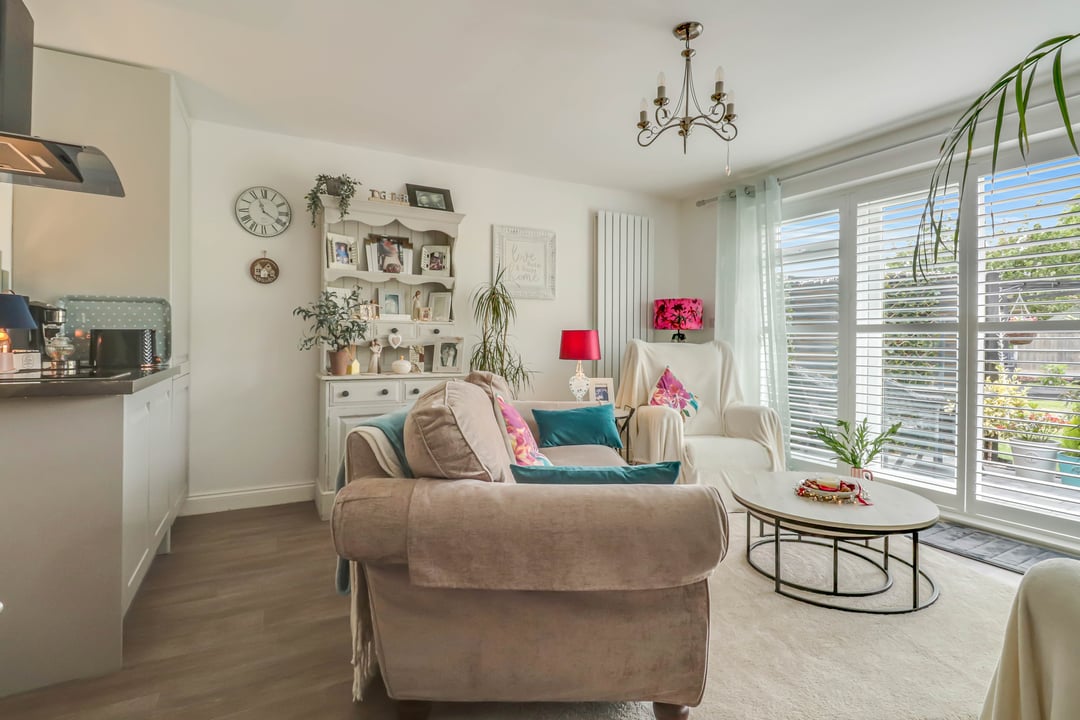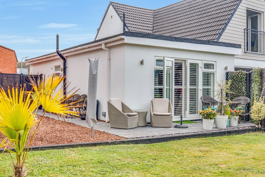 Away from the kitchen, there is space for a seated reception area ahead of double glazed folding doors with bespoke shutter blinds that open directly onto a private garden area.