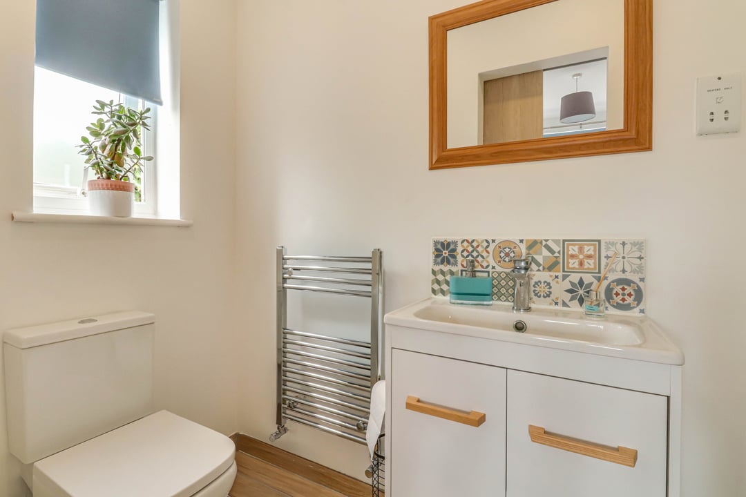 A part tiled room comprising low level W.C. and wash hand basin with storage beneath. Double glazed window to side aspect.