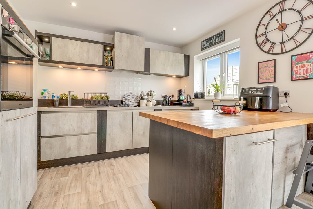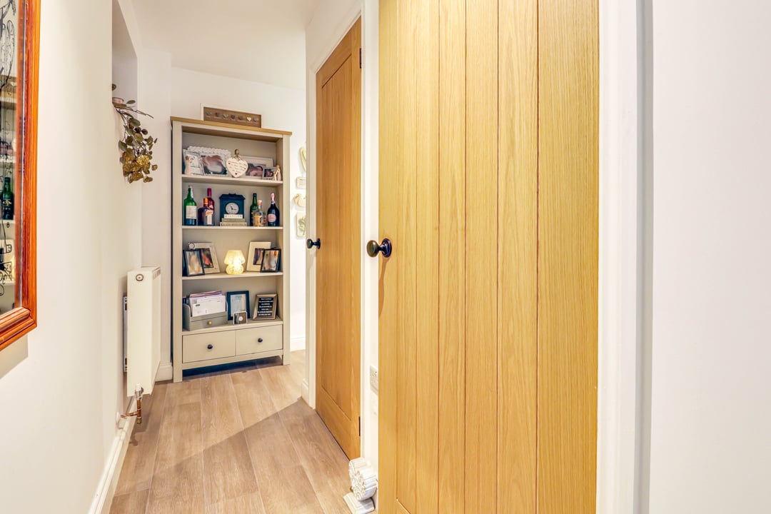 The kitchen comprises a range of full height, eye and base level storage units complemented by the square edge work surfaces with inset sink and mixer tap. Tiled splashbacks. Inset hob under extractor. Built-in oven. Integrated fridge-freezer.