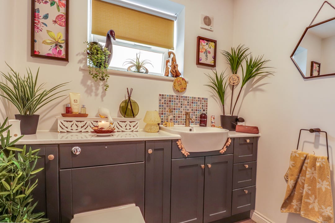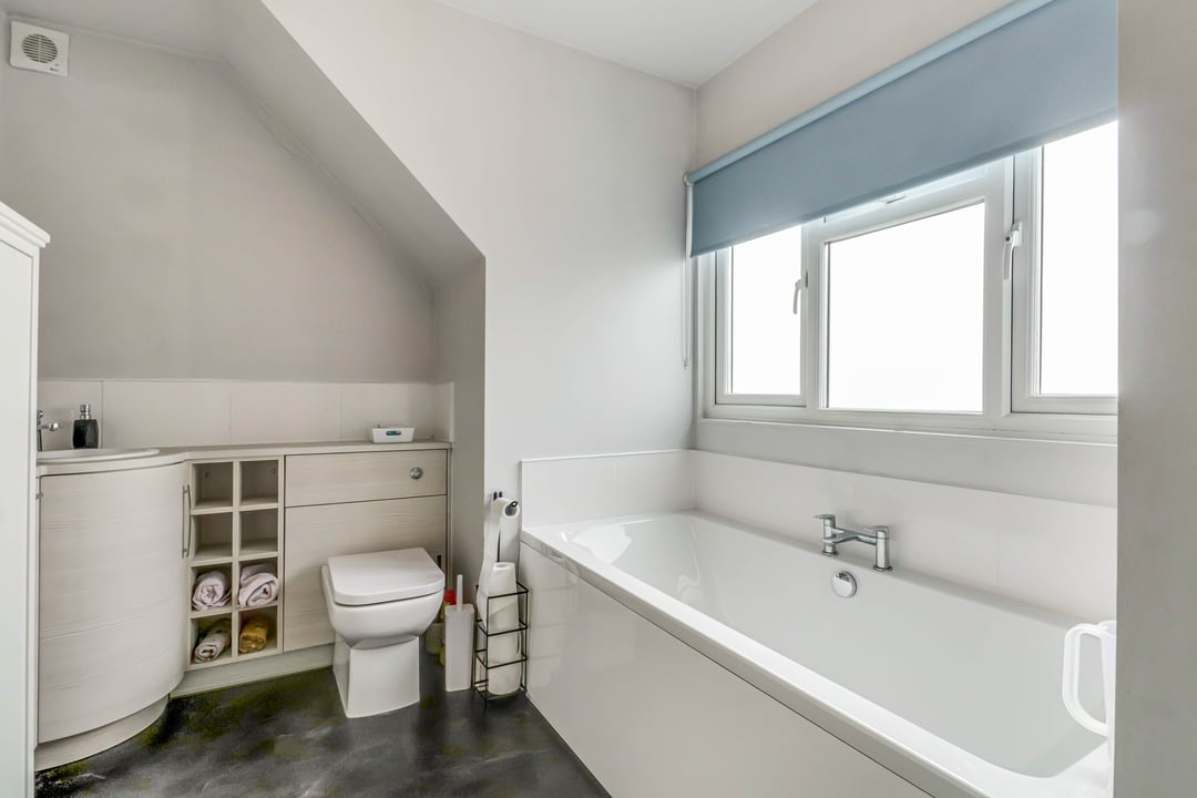 A part tiled room comprising bath, low level W.C. with concealed cistern and a wash hand basin set in large storage units. Additional floor standing storage unit. Extractor fan. Obscure double glazed window to rear aspect.