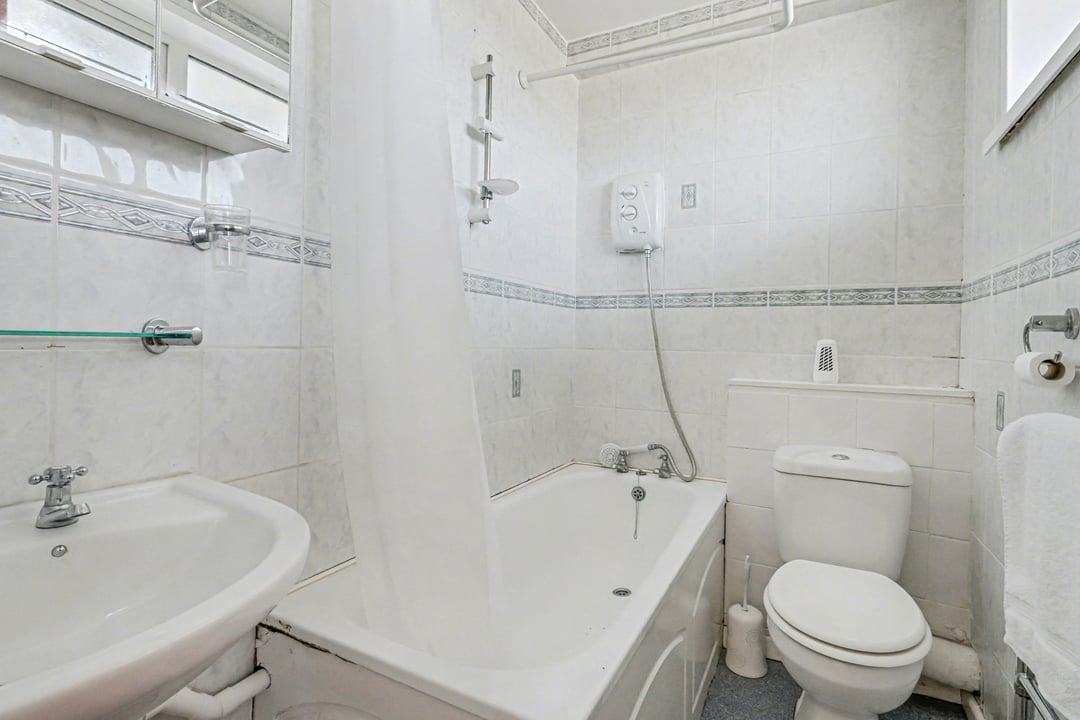 A part tiled room comprising bath with electric shower above, low level W.C. and wash hand basin. Double glazed window to front aspect. Chrome towel radiator.
