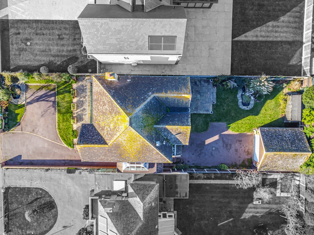 A beautifully maintained garden commencing with an area of lawn, surrounded by mature flower and shrub borders. Water feature. Shed to rear. Access to garage and parking for several vehicles.
