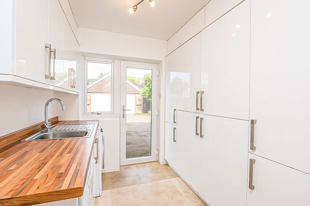 Double glazed window and door to rear aspect. Stainless steel sink with mixer tap. Integrated freezer, washing machine and tumble dryer (all to remain). Range of gloss units housing stopcock, gas meter, electric meter, drawers, and wall-mounted boiler with heating timer.