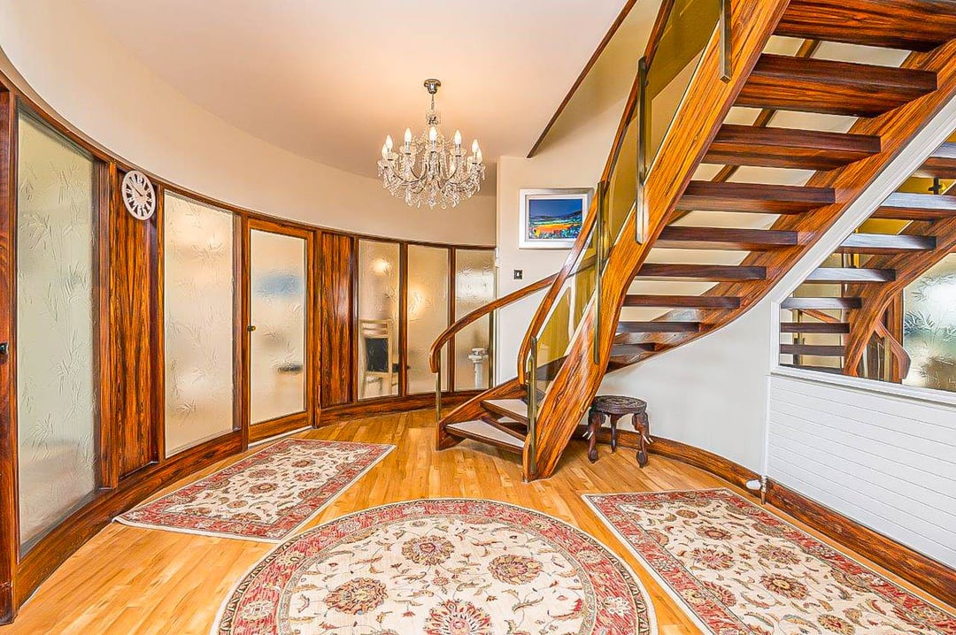 A grand reception hall with stairs rising to the first floor accommodation. Built-in cupboard with shelving and coat storage. Karndean flooring. Doors lead to: