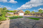 Lawned area with flower and shrub borders. Hard standing for several vehicles. Side access on both sides, including covered porch area with roof lantern and drive-through access to rear garden and garage.