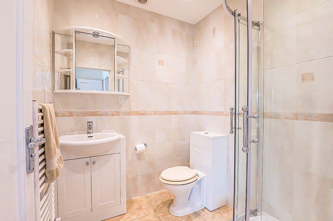 Shower cubicle. Low flush W.C. Vanity unit with mixer tap. Heated towel rail. Mirrored cabinet with shelving. Extractor fan.