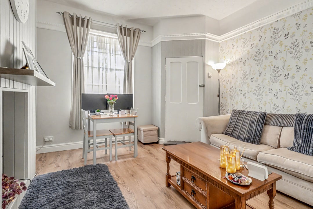 A lovely room with original sash-style window to the front aspect. Laminate wood-effect flooring. Radiator. Feature wood-panelled chimney breast with recess niche and wooden mantle over. Attractive cornice-style picture rail and high textured ceiling. Door to Bedroom. Open access to Kitchen.