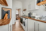 uPVC double glazed window to rear aspect. Fitted with a modern range of eye and base level units, complemented by wooden worktops incorporating a stainless steel sink unit with mixer tap. Built-in electric oven with four-ring gas hob and splashback tiling. Space for upright fridge/freezer and under-counter washing machine. Laminate wood-effect flooring. Radiator. High textured ceiling. Step down to: