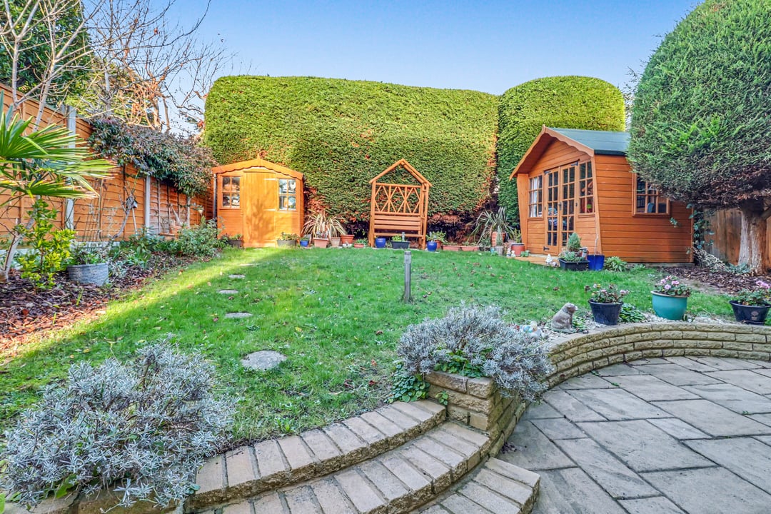 The unoverlooked rear garden commences from the back of the property with a patio entertaining area. The remainder is laid mostly to lawn and is complemented by the planted borders. Timber storage shed and time Summer House to remain. Gated side access to front.
