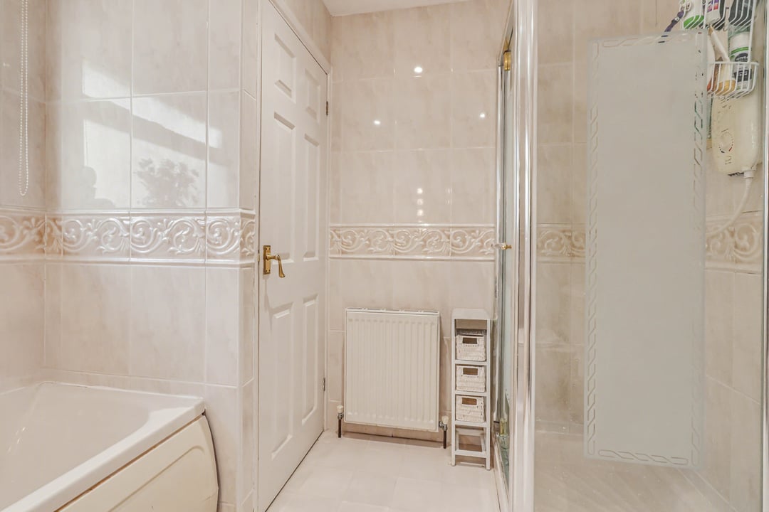 A part tiled room comprising shower cubicle, bath, low level W.C. and pedestal wash hand basin. Access to airing cupboard storage. Extractor fan. Obscure double glazed window to side aspect.