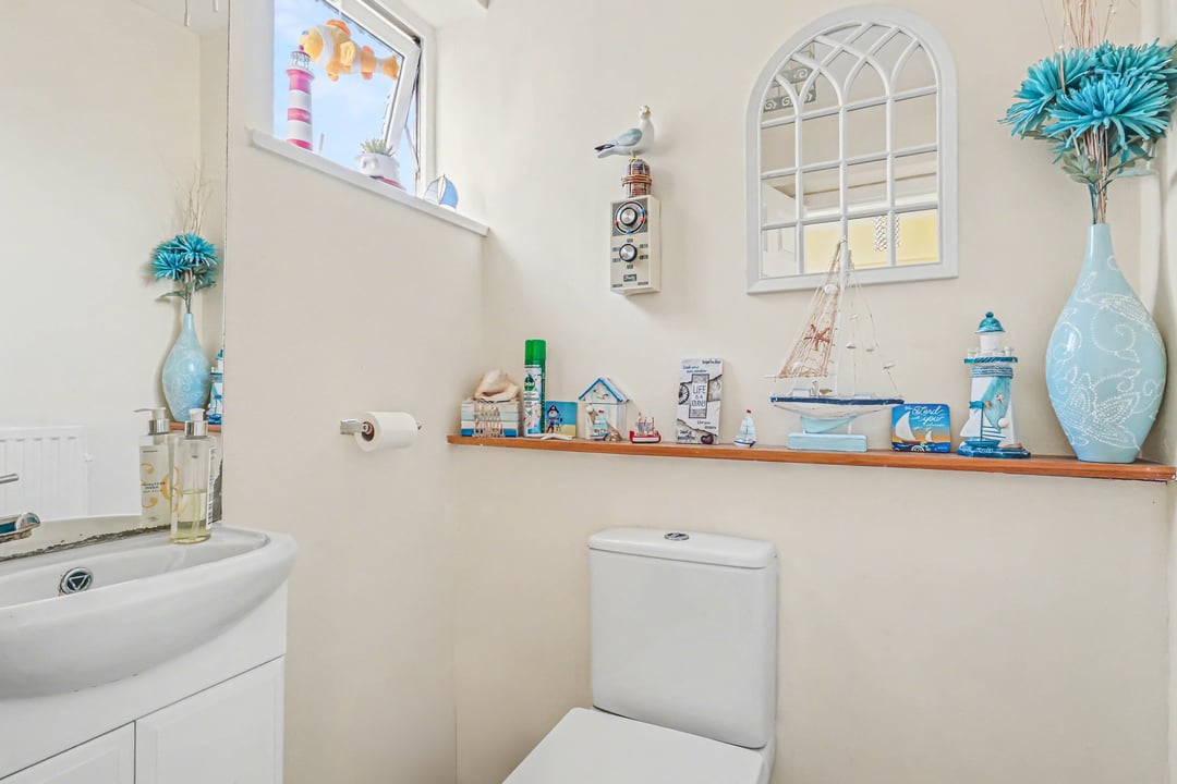 Comprises low level W.C. and wash hand basin with storage beneath. Obscure double glazed window to side aspect.