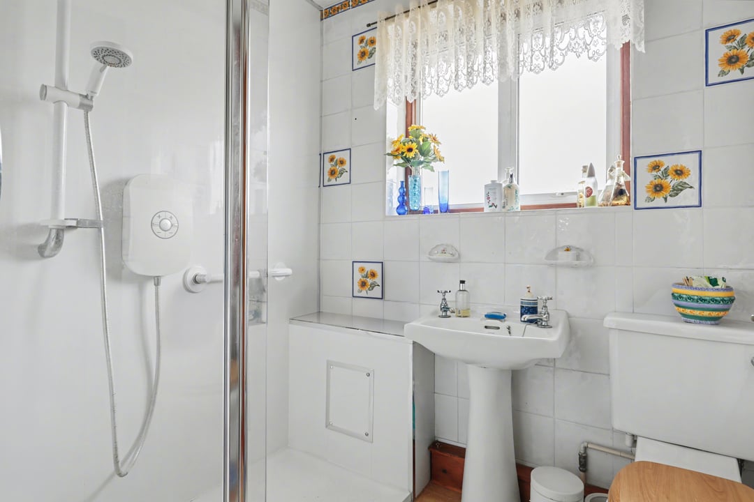 A three piece suite comprising walk in shower with electric power shower, low level WC, hand wash basin, tiled walls, obscure window to rear aspect, extractor.